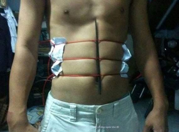 What kind of physique do girls like in guys? Preferences vary widely. Some prefer the cuddly feel of a soft belly, while others are drawn to strong, firm bodies or even rippling muscles. It's tough for women to achieve a muscular six-pack, and it's no easier for men. It requires a strict regimen of diet and exercise over a long period, demonstrating the strong willpower of muscular men. However, with the humorous trick shown below, you can have a six-pack instantly without any exercise. All you need are three strings, two sheets of paper, and a stick to create an irresistibly attractive six-pack. Who said getting in shape wasn't easy?