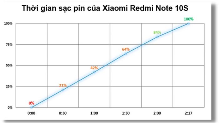 Charging time of Xiaomi Redmi Note 10SThe phone from Xiaomi is equipped with a 5,000 mAh battery with 33 W fast charging technology. With a full charge, I can use it continuously for over 8 hours with tasks like watching YouTube, browsing the web, playing a few games like Arena of Valor. It only takes me 2 hours and 17 minutes to fully charge this phone, quite impressive, isn't it?