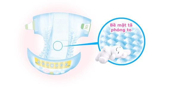 With contact points designed to promote ventilation and reduce the contact area between the diaper and the baby's skin, Merries diapers feature thousands of soft, raised, hollow points on the surface, allowing the skin to only touch half of the soiled diaper surface. The stiff, abrasive points now become softer and smoother.