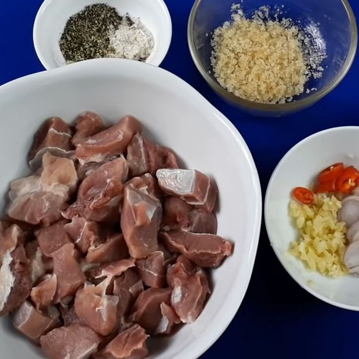 Step 1: Cut the meat into moderately thick slices, then marinate it with fish sauce, oyster sauce, sesame oil, soy sauce, shallots, minced garlic, minced lemongrass, and ground pepper. Marinate for 1-2 hours to allow the meat to absorb the flavors.