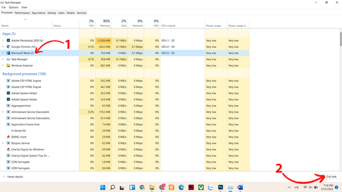Step 2: Locate the Word application experiencing lag or freezing. Then, press End task to close it.