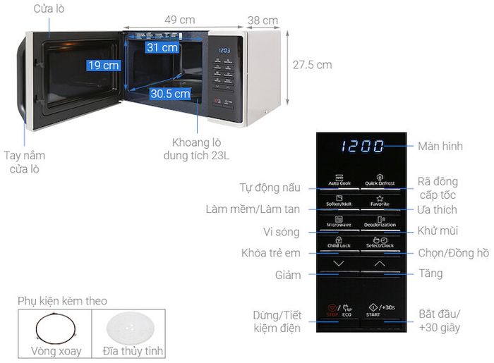 The final microwave oven model we want to review for you is the Samsung MS23K3513AS/SV-N. This product has gained high praise from consumers for its sleek and modern design. The heat-resistant tempered glass door and interior lighting make food observation more convenient.