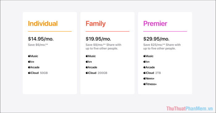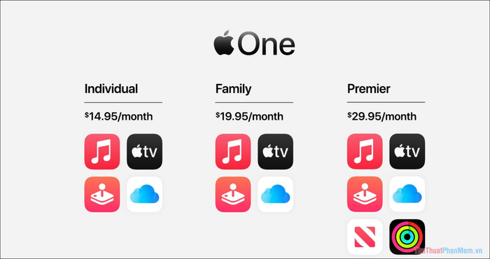In order to cater to a diverse range of users, Apple One offers a variety of different packages to diversify pricing to help users access more easily. The pricing of Apple One currently ranges from: 14.95$, 19.95$, 29.95$ and specifically as follows: