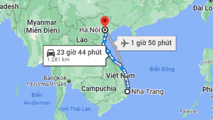 The road distance from Nha Trang to Hanoi is approximately 1,281km.