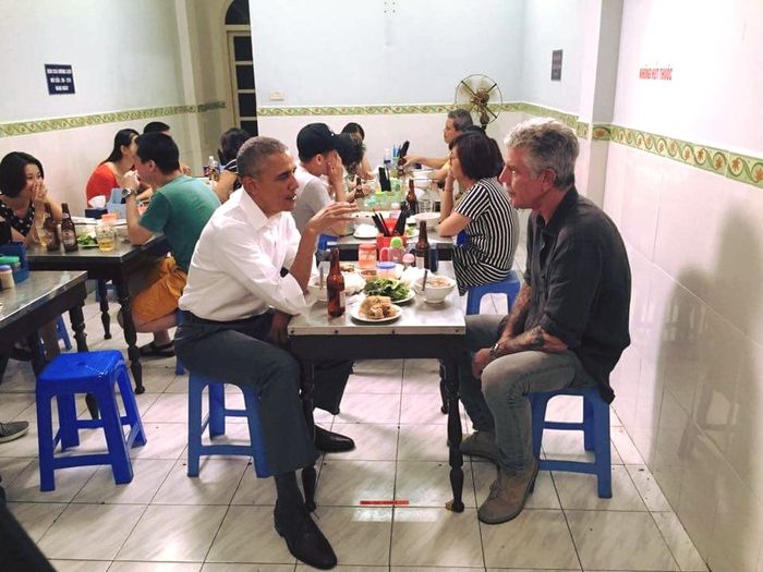 Image of the President enjoying bún chả with the famous American chef, Anthony Bourdain