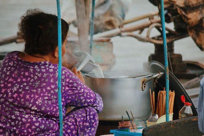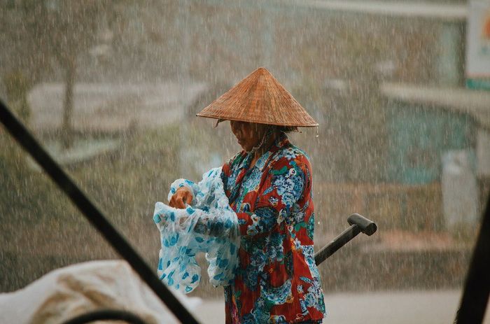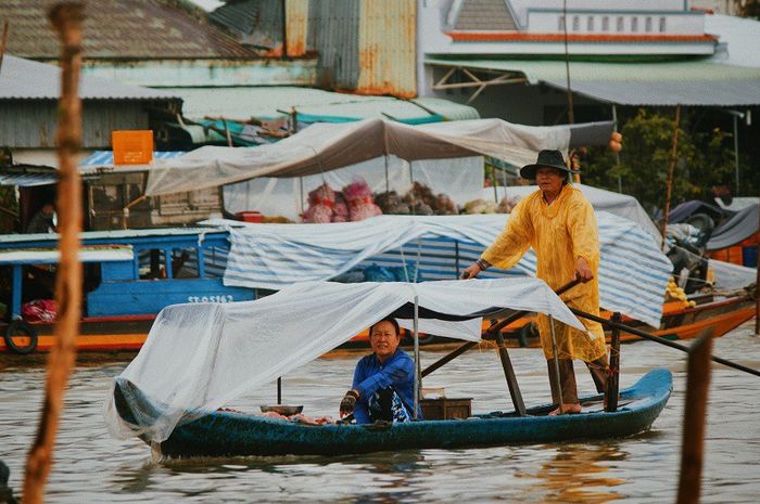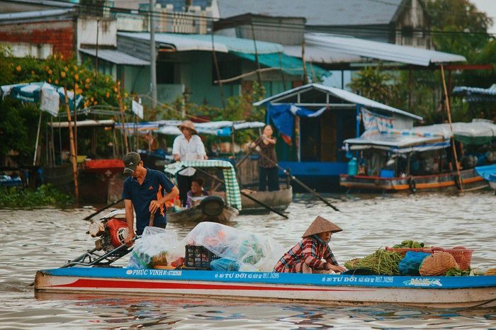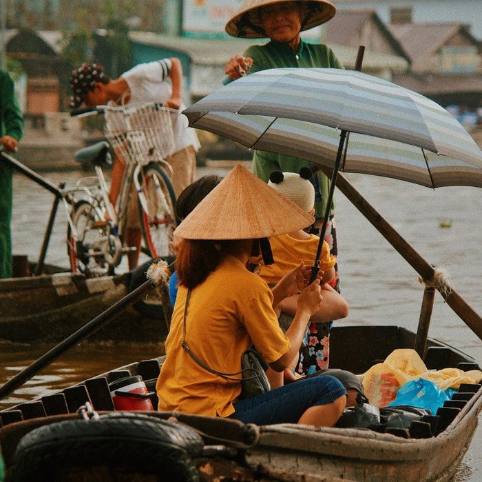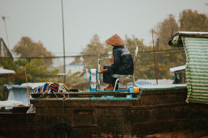 It's unexpectedly delightful when a sudden rain shower pours down. Both sellers and buyers are very comfortable, quickly putting on raincoats then... swiftly continuing their transactions. The river branches seem livelier with the sound of raindrops falling gently on the water surface, the canvas awnings.... intermingled with the constant laughter of the locals.