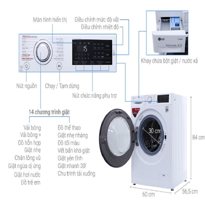 LG washing machines are chosen by Vietnamese consumers for their modern designs, bringing perfect beauty to your home. In addition, the LG FC1408S4W2 8kg front load washing machine with Spa Steam water vapor technology optimally cleans your clothes, eliminating up to 99.9% of harmful bacteria on clothes, protecting your family's sensitive skin. This washing machine also features up to 14 different washing programs, allowing you to freely choose the most suitable program for different types of fabrics. This product's advantages make it a popular choice.