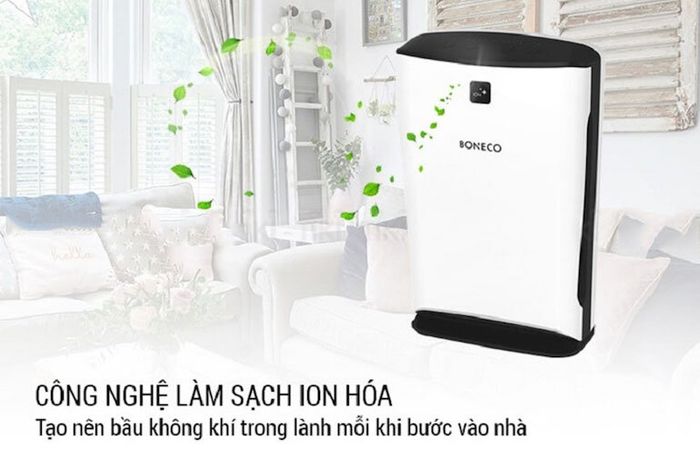 The Boneco P340 air purifier features an elegant and modern design, primarily in white tones, making it suitable for various spaces within your home.