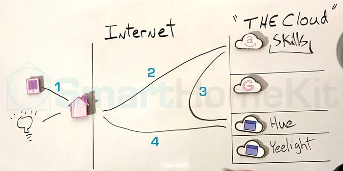 - Phase 3: The smart home platform (Cloud) receives and forwards the commands to the server of subsidiary devices (such as Philips Hue, Yeelight, ...).