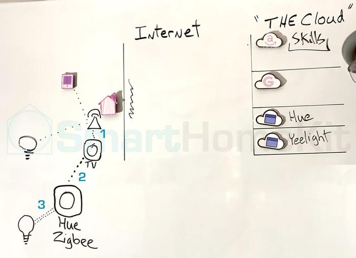 - Phase 3: Central devices like the Philips Hue Bridge encode the commands. Subsequently, they control subsidiary devices within the system (e.g., Zigbee, Z-wave, ...) using your preferred language.