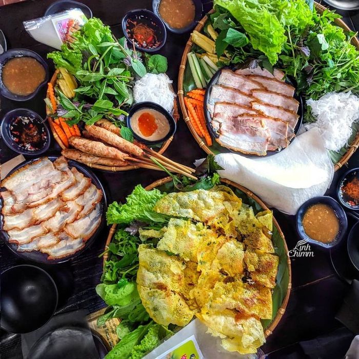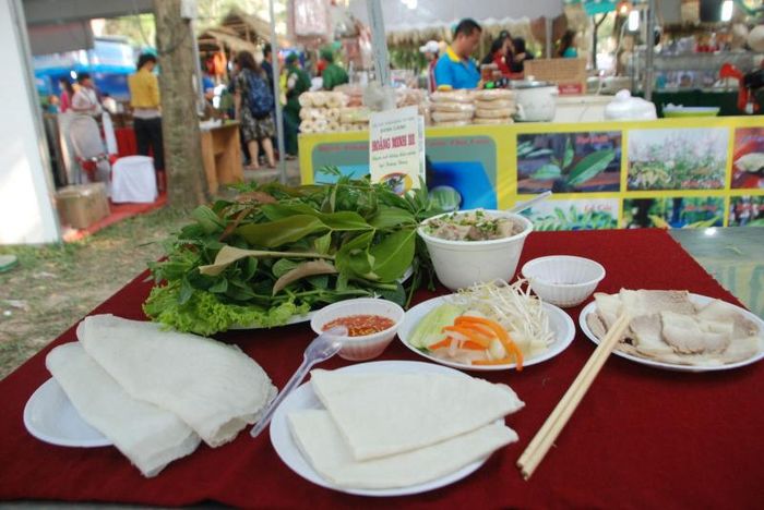 The skill of grilling the young beef is essential, requiring precise control of the flame to get it just right. Enjoy Cầu Mống Grilled Beef with a variety of fresh local herbs (perilla, cilantro, lettuce, sour starfruit, thinly-sliced banana, mint, basil, bean sprouts, etc.), wrapped in thin rice paper, and dipped in fish sauce made from anchovies. At the restaurant, diners can choose from various cuts of the beef, such as shoulder, belly, rump, and skin, which can be prepared in different dishes like stews, tendon, bones, or rare beef noodle soup.