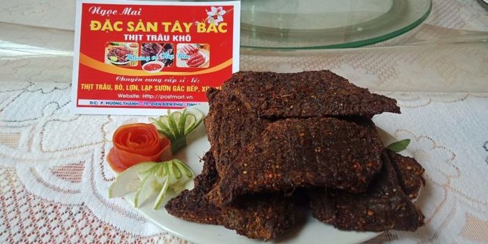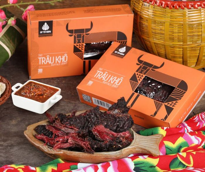Dried Buffalo Meat is a traditional dish that originated from the practice of indigenous people slaughtering buffalo. If not fully consumed, the large chunks of meat are seasoned with spices and then hung over a fire to dry. The process for making dried buffalo and beef jerky is quite straightforward. The meat is cut into large pieces, marinated with salt and typical spices such as ginger, Sichuan pepper, gac, and chili, then dried over the heat of a stove until fully dried.