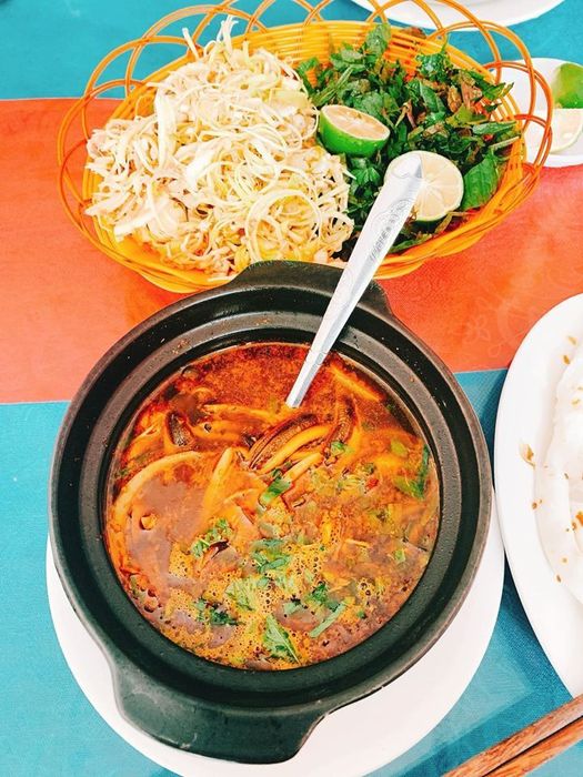 There are two ways to enjoy Lẩu Thả: The dry version, where you mix some fresh herbs, noodles, and pieces of fish, meat, eggs, and crispy rice crackers with the sauce. The soup version is similar, but here, the fish is briefly dipped into the hot broth. The name “Lẩu Thả” comes from this step, where ingredients are dropped or 'thrown' into the hot liquid.
