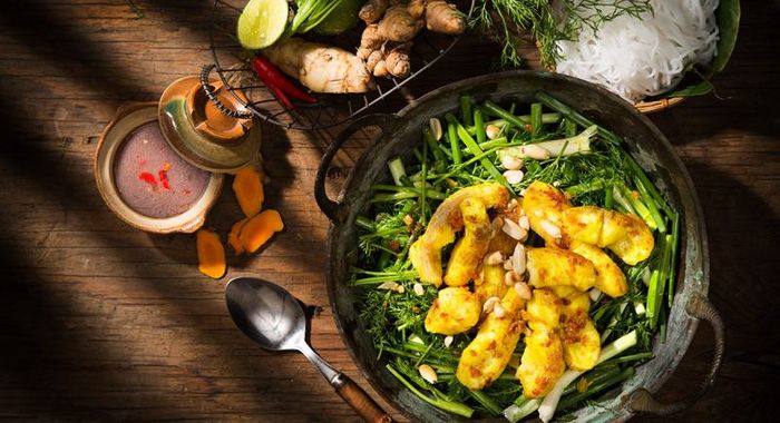 Making Cha Ca La Vong is a delicate process. Fresh, sweet, and boneless Lang fish is usually used. The fish is filleted and marinated with a secret blend of ginger, turmeric, fermented rice, pepper, and fish sauce. After two hours of marinating, the fish is grilled over hot coals, turning it golden brown on all sides. Then, the fish is fried in hot oil and mixed with dill and other herbs, making a flavorful and aromatic dish. Because of its intricate preparation, Cha Ca La Vong was once a dish reserved for wealthier families. It remains one of Hanoi’s most beloved dishes to this day.