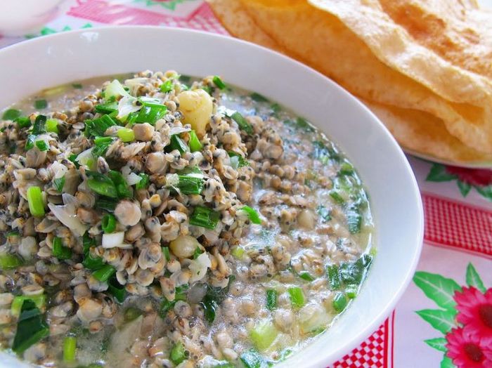 The clams are soaked in rice water to remove dirt, cleaned, and boiled until the shells open. The boiled clam water is filtered and the clam meat is separated. Both the clam meat and broth are the key flavors of this dish, with additional spices and ingredients. Other components include: cold rice, sour starfruit or green mango, herbs, pennywort (also called mint root), thinly sliced banana flowers, fish sauce, pepper, crispy pork, fried pig skin, raw shrimp paste, roasted peanuts, and fried chili oil.
