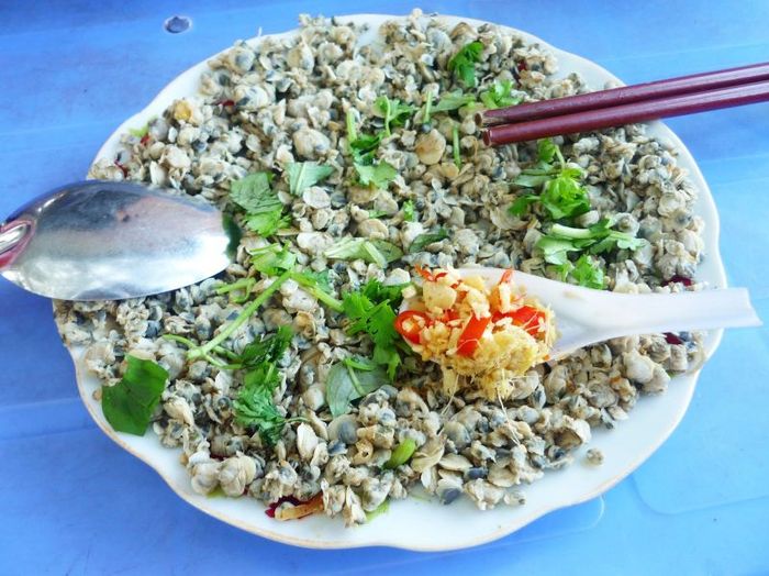 Clam Rice is a popular dish from Hue. This dish consists of cold rice mixed with stir-fried clams, seasoned with oil and spices, clam broth, fermented shrimp paste, mint leaves, banana blossoms, pennywort, herbs, bean sprouts, crispy pork skin, fried noodles, chili powder, whole peanuts, roasted chili, pepper, monosodium glutamate, and salt.