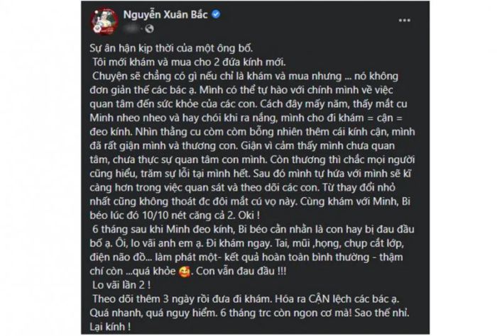 Recently, on his personal page, comedian Xuan Bac shared a personal story about taking his children for an eye check-up. In the post, he was unexpectedly criticized by an anonymous user with a rather rude comment. However, his witty and sharp response quickly won over the public, even silencing his critics. Xuan Bac explained that both of his sons, Minh and Bi Beo, had myopia. However, due to his negligence and Bi's tendency to frequently break or lose his glasses, Xuan Bac had only purchased frames and lenses from a local optician. After some time, when the family visited an eye hospital for a check-up, Xuan Bac was shocked to learn that his children had been wearing glasses with prescriptions 1 to 1.5 degrees stronger than needed. He regretted his oversight. Interestingly, when he shared his experience to advise other parents to pay more attention to their children's eye health, an anonymous account decided to mock him with the comment: 'Go away, you're too annoying, artist.' Despite the rude remark, Xuan Bac responded with his signature humor: 'Oh, are you hungry after waiting this long? Sorry for making you wait.' His clever retort immediately garnered applause from fans, who praised him for standing up to baseless criticism with honesty and wit.
