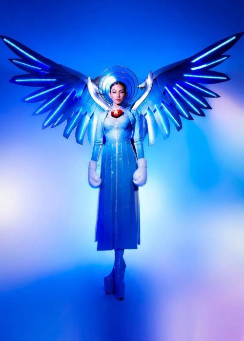 Through this costume, Thùy Tiên, along with the designer, intended to express deep gratitude towards the frontline workers and the global healthcare community for their efforts in combating the pandemic over the past years. The ensemble featured a traditional áo dài, nearly 20cm high boots, boxing gloves, a headpiece, and wings adorned with a symbol of the medical profession at the back. At first glance, the áo dài appeared quite traditional, but the special touch was the glossy leather material and silver accents running along the body of the dress, designed to catch the stage lights and shine brightly.