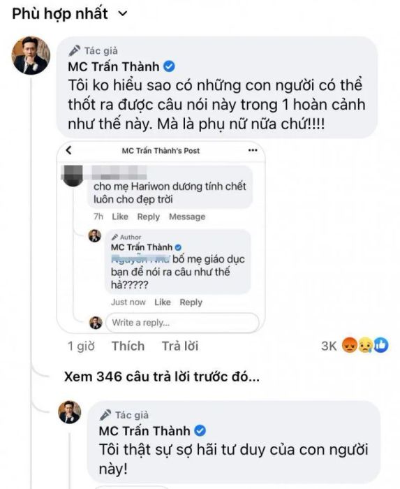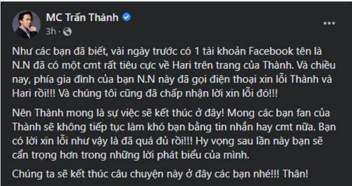 Tran Thanh wrote: "As many of you know, a few days ago, a Facebook account named N.N left a very negative comment about Hari on my page. Today, the family of N.N called to apologize to Hari and me, and we have accepted their apology. I hope we can consider this matter closed! I ask that my fans stop sending messages or comments that make things more difficult for them. Their apology is more than enough. I hope this will make them more mindful of their future words. Let’s end this here, everyone! Thanks!"