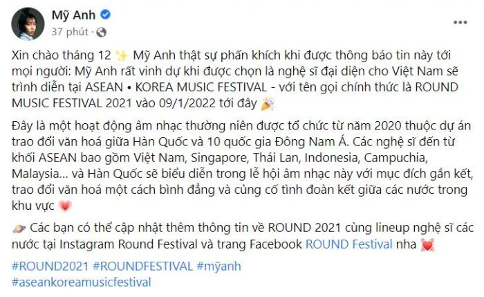 My Anh made her fans proud when she was invited to perform at the Head In The Clouds 2021 music festival in the US, organized by 88rising. She was the only Vietnamese artist on stage, alongside massive names like Rich Brian, Saweetie, CL, DPR Live, and keshi. Recently, the singer shared exciting news with her fans. On her personal Facebook, My Anh announced that she would represent Vietnam at an international event. She wrote, "Hello December. I’m truly thrilled to announce that I have been chosen as the representative artist for Vietnam to perform at the ASEAN • KOREA MUSIC FESTIVAL – officially named ROUND MUSIC FESTIVAL 2021, on January 9th, 2022."