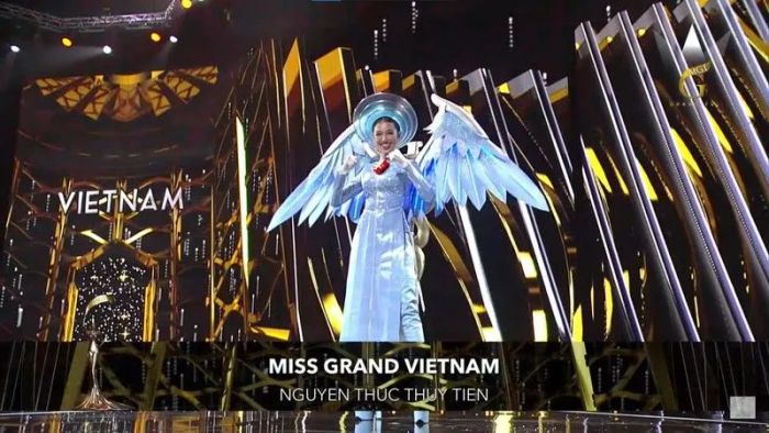 The golden snakes wrapped around syringes behind her wings symbolized the medical profession, effectively amplifying the costume's message. As Thùy Tiên reached the center of the stage, the lighting was skillfully dimmed to highlight the angelic wings, making them even more spectacular. Additionally, the heart-shaped design in the middle of her chest, featuring the red and yellow colors of the Vietnamese flag, also captured the audience's attention.