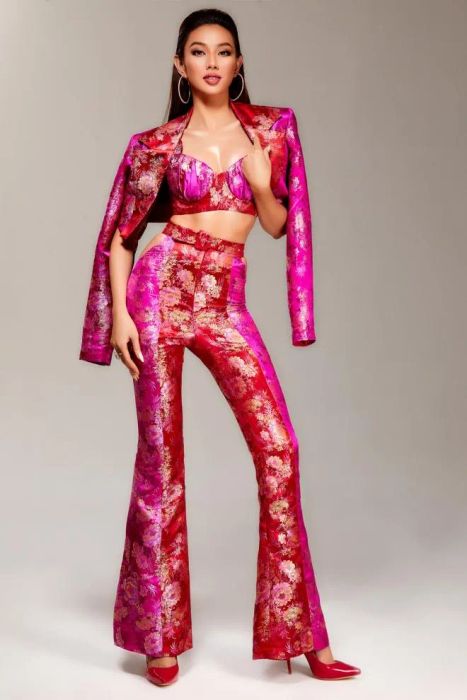 For the challenge, the 20-year-old beauty queen chose a deep red dress adorned with golden bronze drum patterns, a symbol of Vietnamese culture. The fringed details on the dress’s side added a graceful touch to her movements, making her presence even more captivating. The dress was designed by Phạm Bảo Toàn and Huỳnh Sĩ Toàn. During her presentation for the Beauty with a Purpose project, Đỗ Thị Hà opted for a chic white suit. The cropped pants gave the outfit a fresh, youthful vibe, keeping it light and dynamic while avoiding a formal, heavy look.