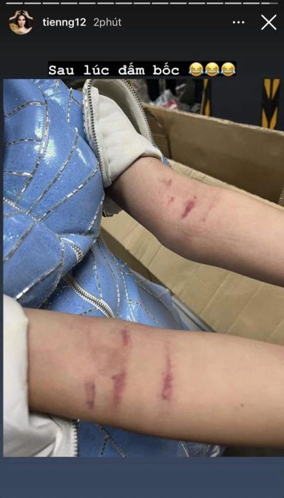 Once the competition concluded, Thùy Tiên surprised fans by sharing behind-the-scenes images that raised concerns. Specifically, she posted a photo showing her arm covered in bruises and cuts, with a caption stating, ‘After the boxing session.’
