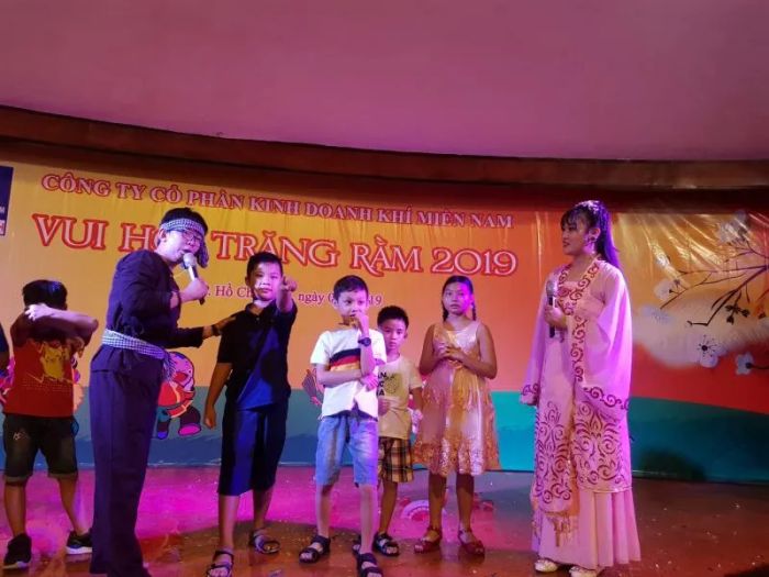 Cuoi (Hang Nga) should start playing games as soon as they appear to create a strong impression on the children. These games can be used when the program is delayed (e.g., when performers aren’t ready or when waiting for VIP guests). Cuoi and Hang Nga appear in a lively atmosphere with upbeat music: