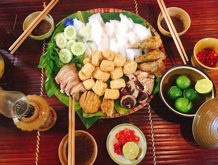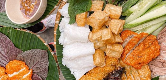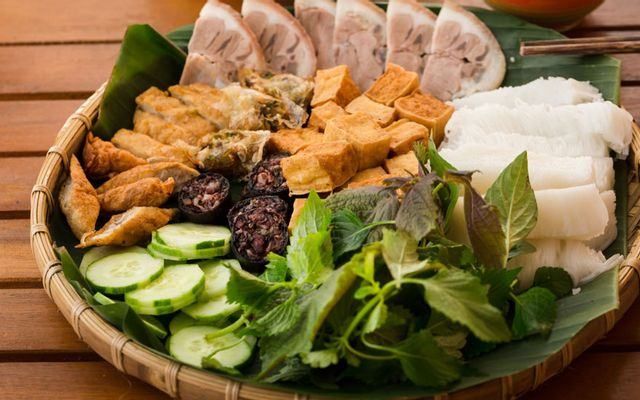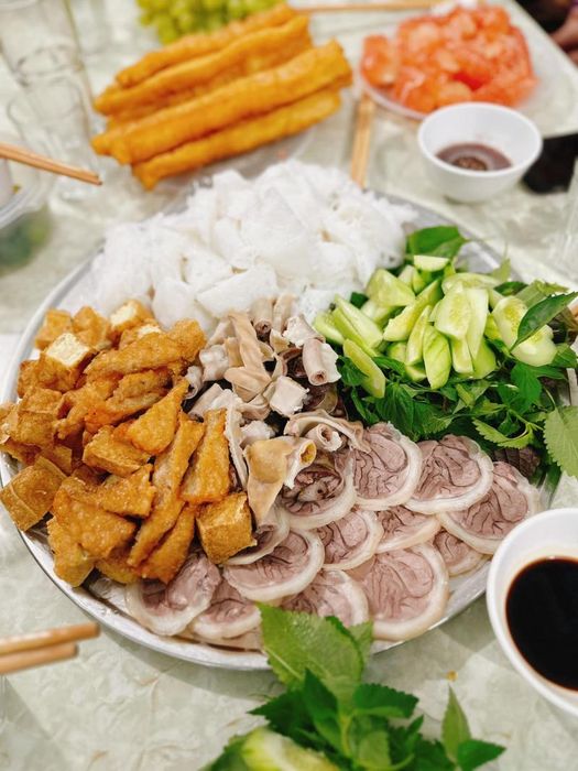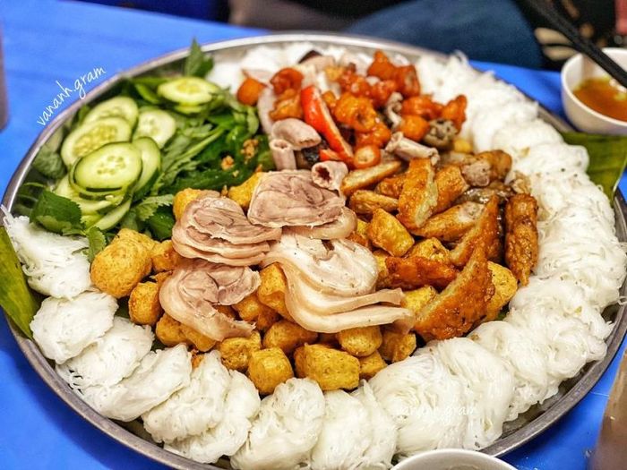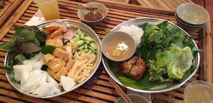 If you're looking to taste authentic Bún Đậu Mắm Tôm in Hanoi, you can't miss Bún Đậu Mẹt Hoàn Kiếm. The best part of the dish here is the perfectly square pieces of tofu, golden-fried on the outside and soft on the inside. The thinly sliced and beautifully arranged pork leg is both sweet and tender, making each bite irresistible.