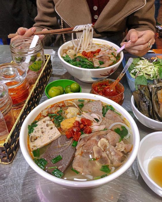 If you're a fan of Bún Bò Huế in Tây Hồ, you've probably heard of Bún Bò Huế Hoàng Cung. Behind this impressive and distinctly Huế name lies a bowl of flavorful, authentic Bún Bò Huế that you must try if you're in the area. The dish includes beef, pork sausage, beef ball, quail eggs, crab cake, beef blood, and pork trotters. The special bowl has even more toppings, making it look more full and appetizing. The broth here has a rich taste of simmered bones, not a diluted MSG flavor. They use thicker noodles, true to the traditional Bún Bò Huế standard. When served, add some chili oil and fresh herbs to complete the experience.