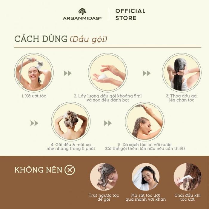 - Bước 4: Xả sạch tóc lại với nước (có thể gội thêm lần nữa nếu cần thiết). Sử dụng cùng dầu xả Arganmidas để đạt hiệu quả tốt nhất. Hiệu quả của sản phẩm còn tùy thuộc và chất tóc và độ tẩy/nhuộm của mỗi người.