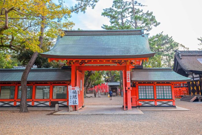 As autumn arrives, the shrine takes on a peaceful beauty, with golden leaves scattered across the stone paths lined with ancient trees. The grounds of Sumiyoshi-taisha Shrine feature four main wooden halls, distinguished by the unique and solemn Sumiyoshi-zukuri architectural style.
