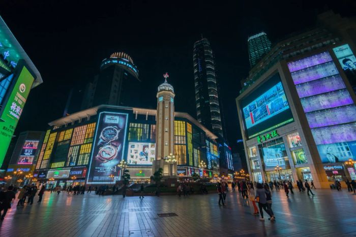 If you want to experience the vibrant pulse of Chongqing, don’t miss Jiefangbei Pedestrian Street. Located in the heart of the Jiefangbei commercial district, this area buzzes with high-end shops, luxury shopping centers, and enticing street food.