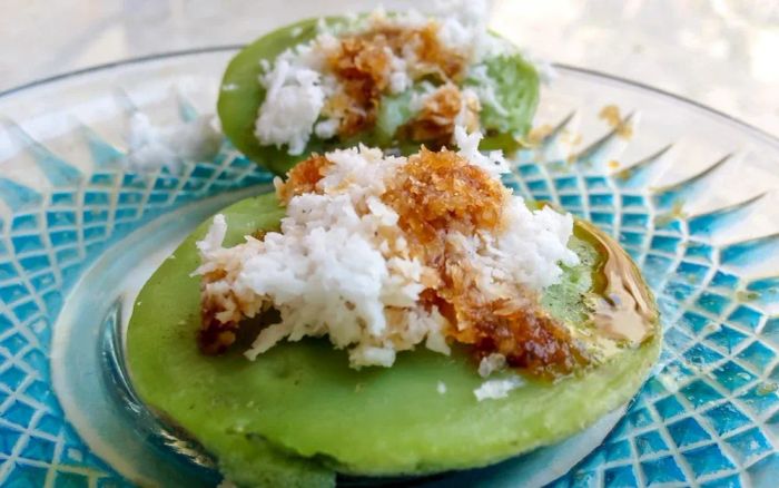 Laklak is a traditional Balinese dessert made from rice flour, sugar, coconut milk, and pandan leaves. These ingredients are poured into traditional molds to create small, soft, and round cakes with a distinctive green hue.