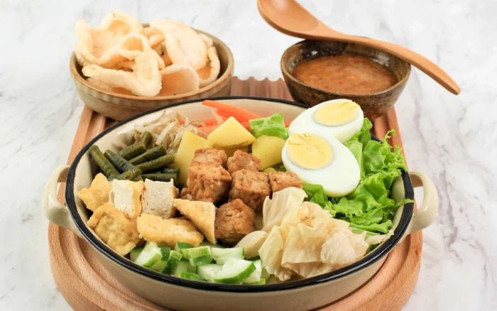 Each plate of Gado-Gado typically includes a variety of vegetables such as water spinach, carrots, cabbage, and tofu, which are chopped or prepared according to personal preference. These ingredients are arranged on a plate and often paired with tempeh, a soybean-based cake.