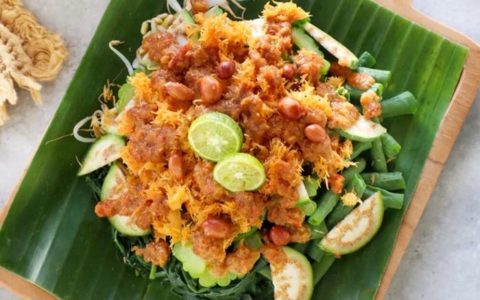 The Urap Sayur sauce is usually made from peanuts or candlenuts, garlic, chili, sugar, salt, and coconut milk, creating a sweet, slightly tangy, and rich flavor. This sauce is evenly poured over the mixed vegetables, resulting in a delicious and nutritious salad.