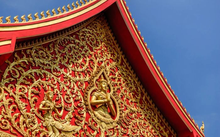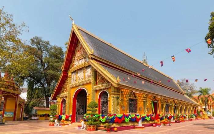 Wat Mai, or Wat Mai Suwannaphumaham, is an ancient and sacred temple in Luang Prabang. It is renowned for its five-tiered red-tiled roof and intricate decorations of black lacquer, red paint, and gold leaf. Additionally, the temple’s front porch is elaborately designed with golden reliefs depicting stories of Buddha and famous Lao deities.