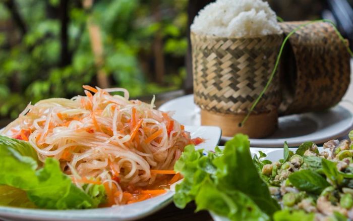- Luang Prabang Nam Khao: Sticky rice with grilled meat, fresh herbs, and dipping sauce.
