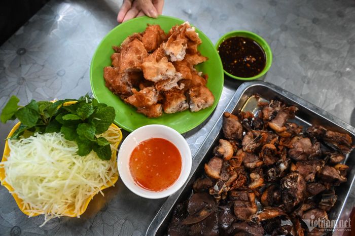 Once cooked, the bánh áp chao can be cut into bite-sized pieces. It is typically served with fresh vegetables, a sweet and sour dipping sauce, and thinly shredded papaya. Many people also enjoy it with grilled (or fried) duck, seasoned with basil, or with duck feet, liver, and gizzards. It’s often dipped in a spicy fish sauce with pickled bamboo shoots. Nowadays, to cater to tourists, a delicious pork version of bánh áp chao is also available.