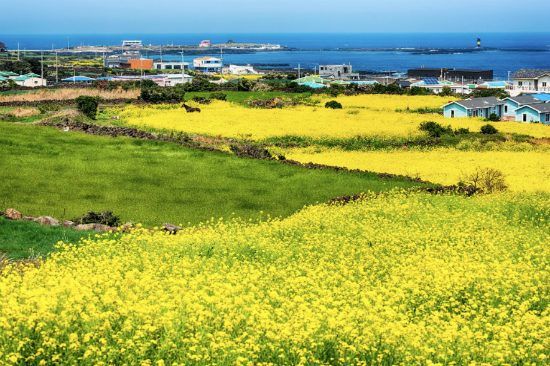 Additionally, when visiting Jeju Island in South Korea during spring, travelers can easily spot ancient villages surrounded by stone walls, hidden amidst endless fields of golden canola flowers. The radiant yellow blossoms illuminate the landscape, captivating both domestic and international tourists.