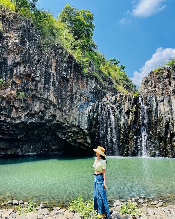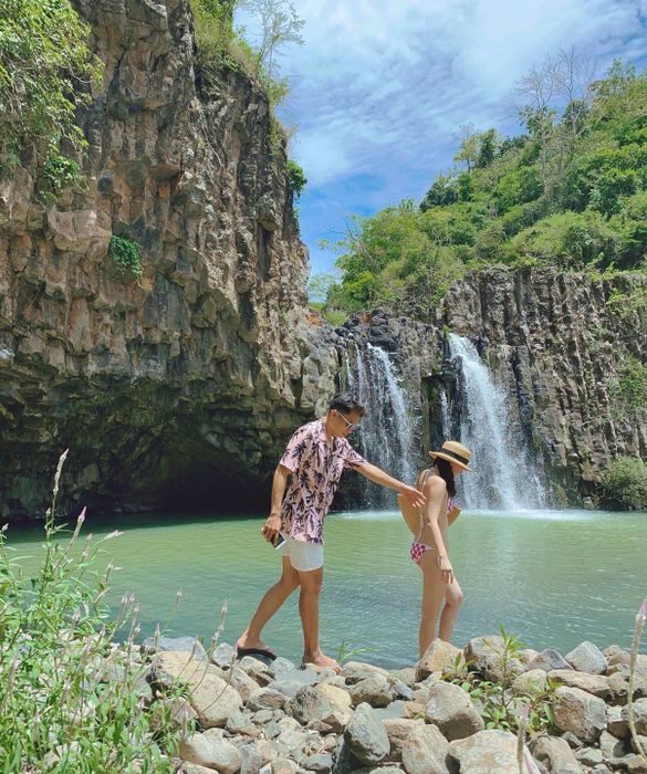 Vực Hòm Waterfall cascades from a height of approximately 20 meters year-round. Surrounding the waterfall are towering basalt columns, stacked in a manner reminiscent of an inverted Gành Đá Đĩa. Reaching this stunning waterfall requires navigating a challenging and rugged path, making it an ideal destination for adventure seekers and those looking to explore something new during their Phú Yên travels.