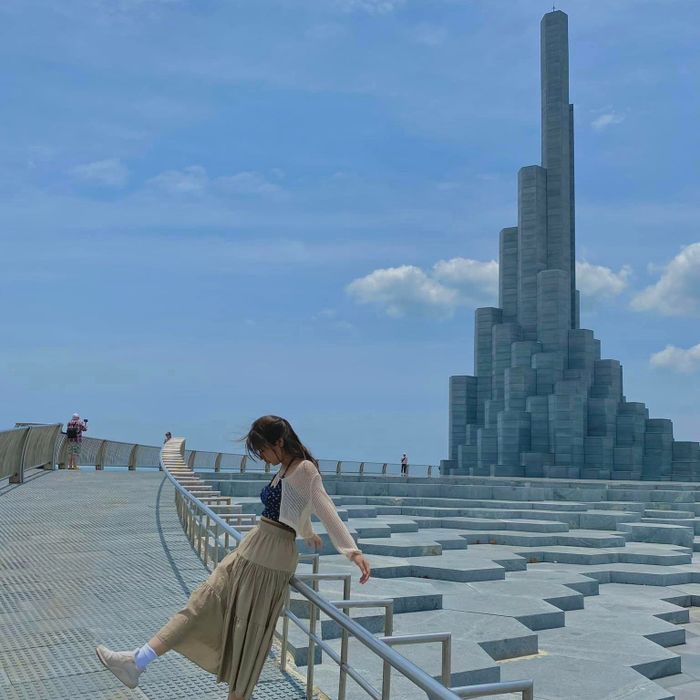 Tháp Nghinh Phong is located in Nghinh Phong Square in Tuy Hòa city. Inspired by the stacked rock formations of Gành Đá Dĩa, the tower features two tall columns resembling piled stones. The taller column symbolizes Lạc Long Quân, while the shorter one represents Âu Cơ, with the lower steps signifying their 100 children. This site is a popular spot for leisure and photography among locals and tourists alike.