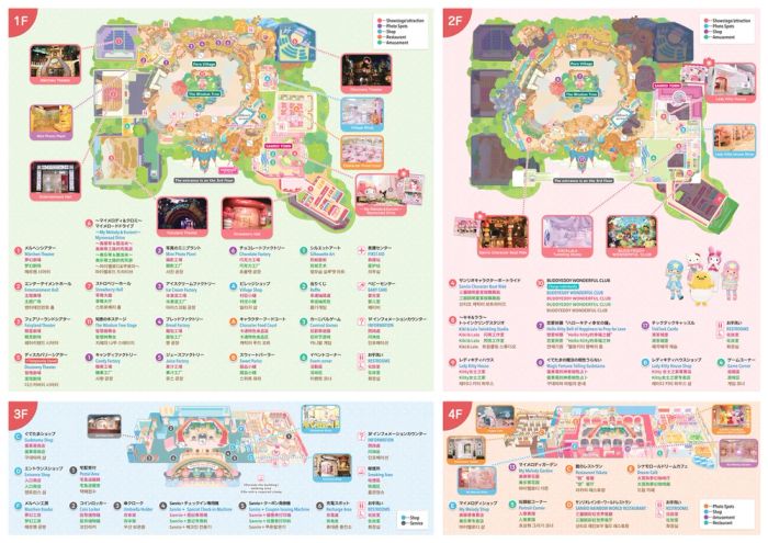 Sanrio Puroland is divided into four floors, connected by escalators and staircases. Each floor offers unique attractions: