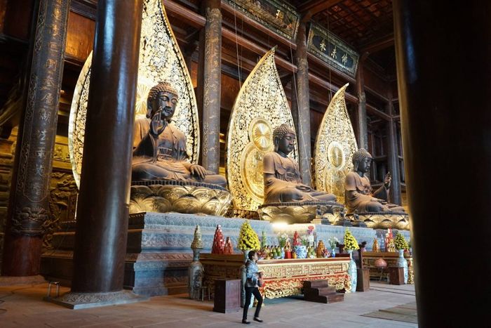 Tam Thế Shrine, located at the highest point, symbolizes enlightenment in Buddhism. Covering 5,400 m², it is surrounded by large columns. The shrine’s centerpiece is three black bronze statues of Tam Thế Buddha, each 7.2 meters tall and weighing 200 tons, representing the past, present, and future. Inside, the space is decorated with 12,000 volcanic stone reliefs from Indonesia, depicting Buddhist legends.