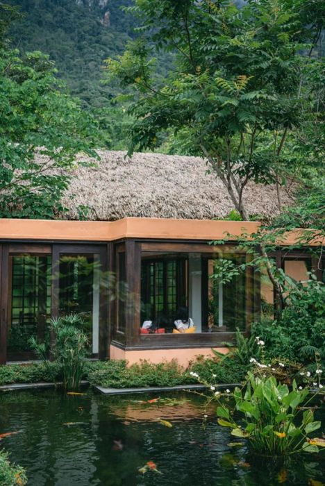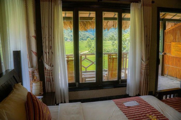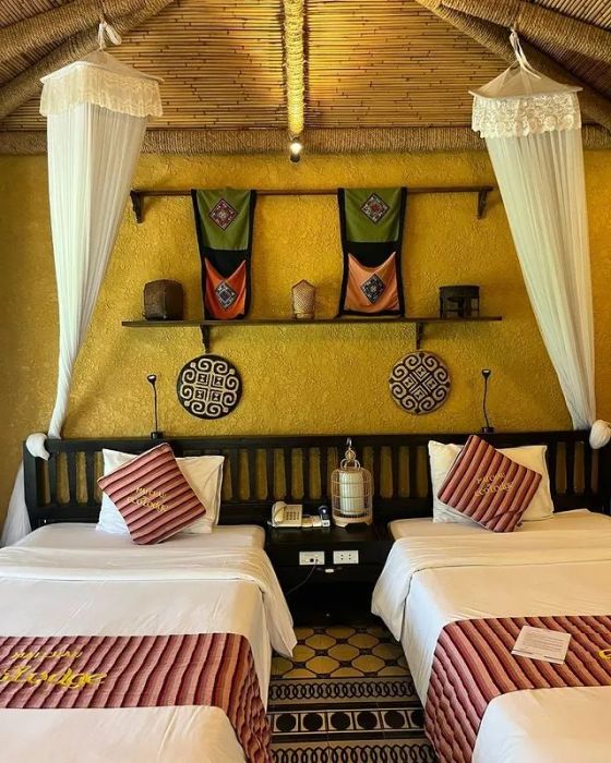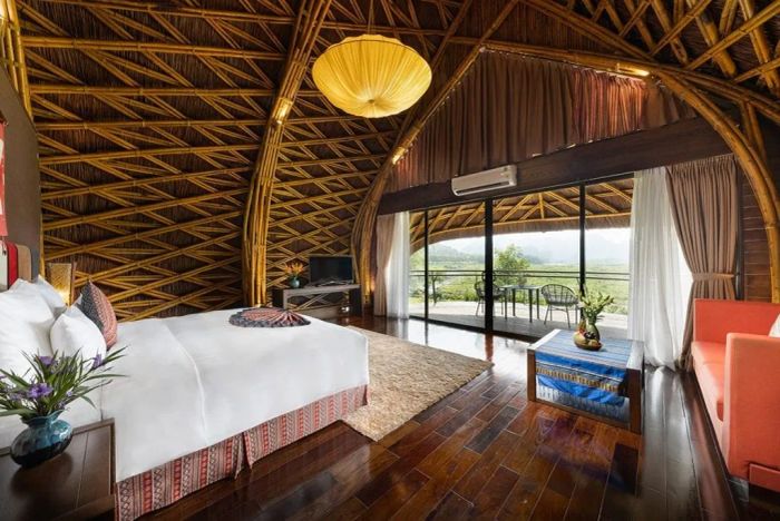 Mai Châu Lodge draws inspiration from traditional stilt houses. The resort features 16 rooms, each with a private balcony. All rooms are adorned with traditional motifs and equipped with modern amenities. The restaurant overlooks a lotus pond, lush green fields, and a swimming pool. Guests can enjoy Mai Châu specialties here, and couples can opt for a romantic candlelit dinner.