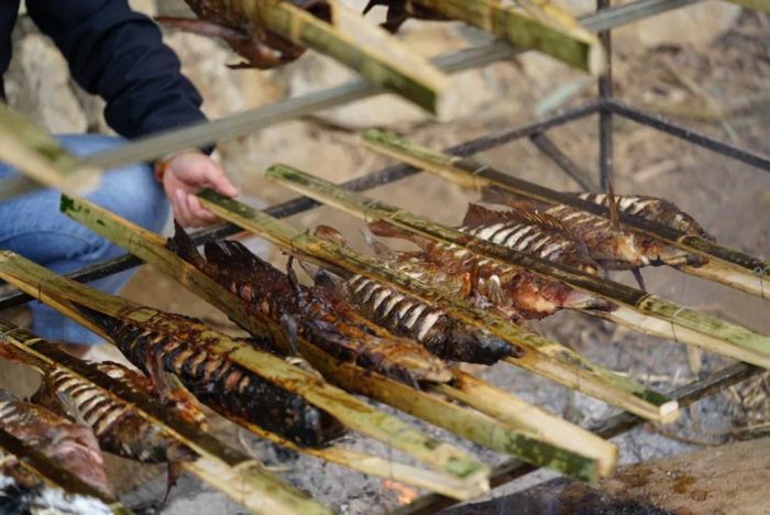 Locals use Đà River fish to prepare various delicious dishes, with grilled fish being particularly famous. The fish, living in a natural environment, have firm, fragrant, sweet flesh with little fat. After cleaning, the fish are skewered with small bamboo sticks, dried in the sun, and then grilled. They are marinated with ginger, lemongrass, galangal, onions, and wild pepper seeds.
