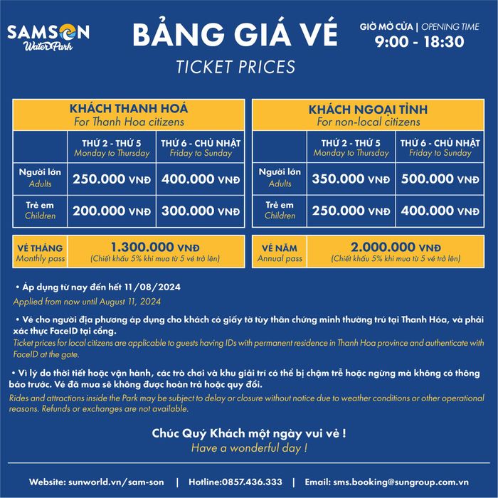 Residents of Thanh Hóa will enjoy special discounted prices ranging from 250,000 VND to 400,000 VND for adults, and from 200,000 VND to 300,000 VND for children, depending on whether it's a weekday or a weekend.
