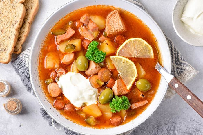 This soup is a flavorful mix of meats (which can include beef, pork, chicken, or even smoked meats and sausages), fish, vegetables, pickles, and an assortment of aromatic spices. The result is a bold, distinctive flavor that leaves a lasting impression. Loved not only for its rich nutrition, but also for its creative and versatile use of ingredients, Solyanka reflects the inventive spirit of Russian cuisine. It is typically served hot, often with a slice of lemon and sour cream to add a light tang. Solyanka is perfect for warming up on chilly days, offering both comfort and satisfaction.
