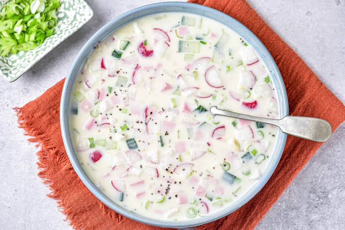 Okroshka is a refreshing cold soup perfect for summer. It combines potatoes, cucumbers, onions, dill, and either meat or sausage, all mixed in a chilled broth with a touch of sour cream or kvass (a fermented bread drink).