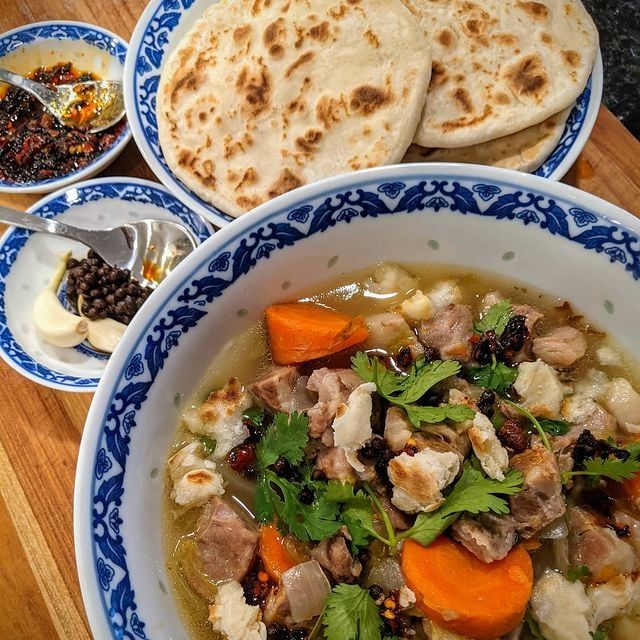 Bread crumbs with lamb soup is considered a culinary symbol of Xinjiang. The main ingredients, lamb and bread, captivate diners from the very first bite. Carefully selected bread is torn into small pieces, while the lamb is seasoned with spices like cumin, chives, star anise, and Chinese prickly ash. The meat is then simmered in water until it absorbs all the flavors. The bread crumbs are poured over the lamb mixture, creating a delightful combination of soft, fragrant bread, sweet garlic, and chili sauce.